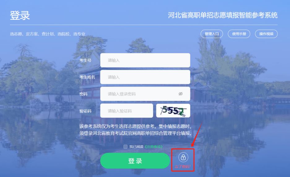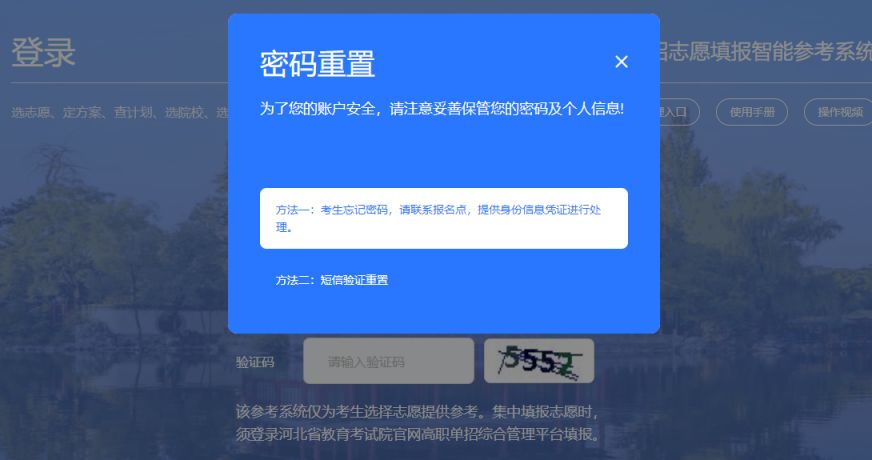 重置河北省高职单招志愿填报智能参考系统入口密码:
