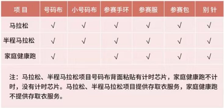 注:芯片检测仅限于马拉松选手、半程马拉松选手,家庭健康跑无需检测芯片。参赛装备不允许代领。选手有隐瞒、虚报填写信息的,组委会将不子发放参赛物品。同时选手报名费将不予退还。