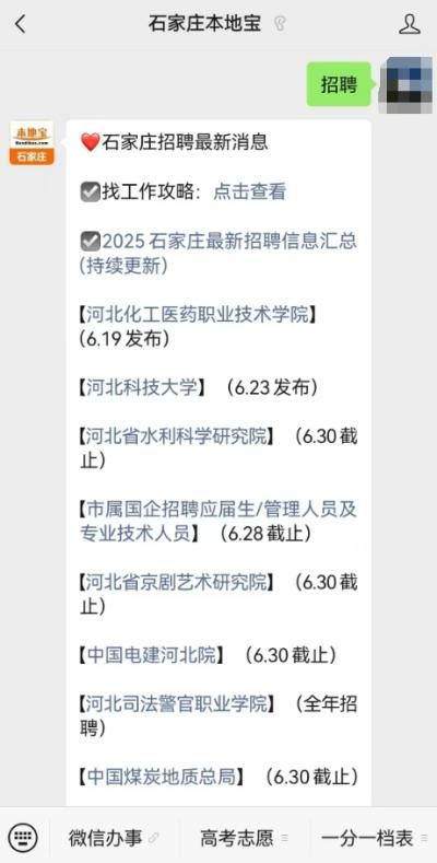 温馨提示:微信搜索公众号【石家庄本地宝】,关注后在对话框回复【招聘】可获取石家庄近期招聘信息汇总、招聘公告/岗位表/报名入口/报名时间,包括事业单位/国企/央企/学校/大厂等。