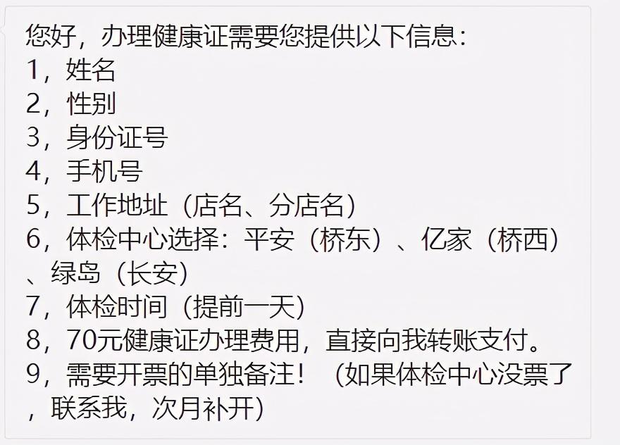 1. "查询官方信息:" 建议您通过石家庄市卫生健康委员会官方网站、石家庄市疾控中心官网或官方微信公众号查询最新的健康证办理指南和收费标准。 2. "直接咨询体检机构:" 确定几个您方便去的体检机构(可以是医院或民营机构),直接打电话或亲自去咨询具体的费用项目和最终价格。 3. "考虑所在单位要求:" 如果您是单位举报 -